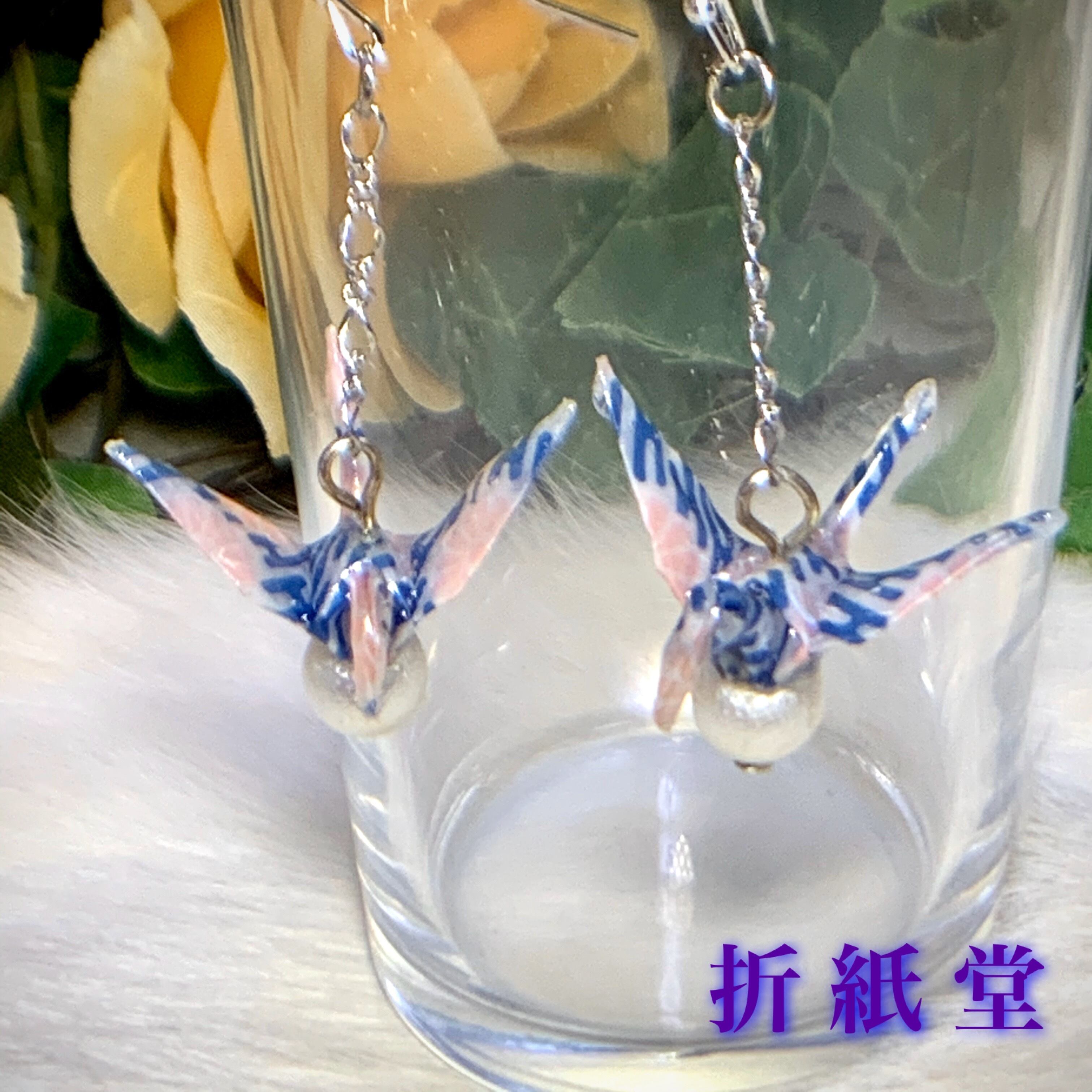 和紙・千代紙で折った折り鶴ハンドメイドのピアス・イヤリングです。